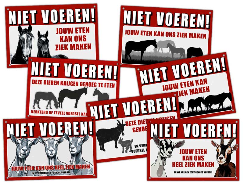 Veel mensen vinden het leuk om dieren in de wei te voeren. Heel goed bedoeld maar van verkeerd voer kunnen die dieren erg ziek worden. Om hier tegen te waarschuwen zijn deze bordjes zeer geschikt. Ze zijn gemaakt van stevig materiaal dat niet stuk waait en kunnen makkelijk aan de omheining bevestigd worden. De bordjes hebben een afmeting van 30×20 cm.
