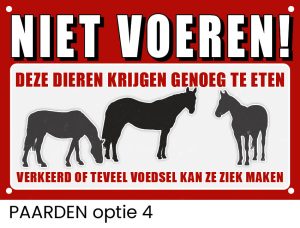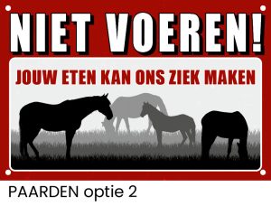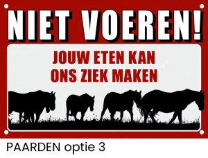 Om duidelijk te maken dat je dierbare paard of pony geen eten dat voor mensen bedoeld is mag hebben kun je een niet voeren bordje aan het hek bevestigen. Deze bordjes zijn gemaakt van 3 mm Dibond®, een sterk materiaal dat niet kapot waait en zeer geschikt is voor gebruik buiten. Het formaat is 30×20 cm en de bordjes zijn voorzien van 4 boorgaten (Ø 6 mm) om ze met bijvoorbeeld tiewraps aan de omheining vast te maken.